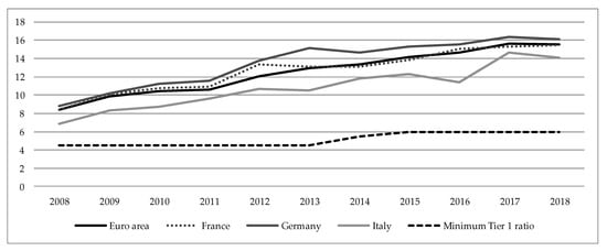 Tier 1 capital ratio in the analyzed countries on the background of the euro area in the years of 2008–2018—in percent (source: own work based on the ECB data).