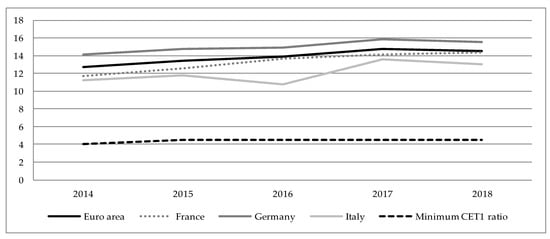 Common Equity Tier 1 in the analyzed countries on the background of the euro area in the years of 2014–2018—in percent (source: own work based on the ECB data).