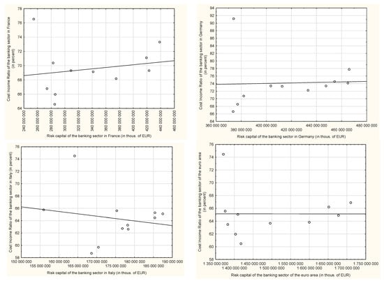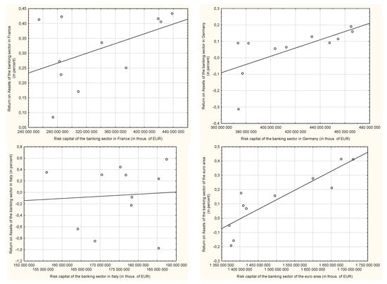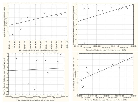 Then, the relations between risk capital and profitability of equity of analyzed banking sectors were assessed. Based on the obtained description statistics (see Appendix A) and dependencies illustrated on two-dimensional scatterplots (see Figure 5), mostly positive dependences were observed. Namely, a quite strong dependence was identified for the euro area banking sector (see Table 2), while in France and Germany this dependence was moderate. As before, the estimation of the linear regression function showed no correlation for the Italian banking sector. Moreover, the conducted research shows that additional costs related to necessity to increase the size of bank risk capital do not impact negatively on ROE ratio of the analyzed banking sectors. The obtained results do not confirm the negative implications accompanying Visegrad Group countries banking sectors. Finally, while analyzing the values of coefficients of determination (), it should be stated that, ceteris paribus, size of bank risk capital to a satisfactory degree explained volatility of return on equity ratio.