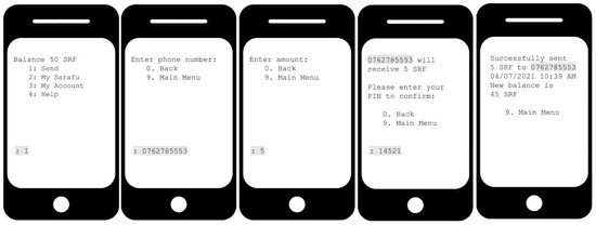 The 2020-21 Sarafu Network Mobile Phone Menus. The network allows trading CCs without an Internet connection. This example shows a user sending five Sarafu tokens to another user, after which both parties would receive a receipt SMS for the transaction. A similar menu was used from 2018–2019 although at that time it was a community token (either Bangla, Miyani, Zeni, Gatina etc) not Sarafu that was transferred by standard individual account holders.