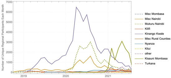 In early 2020 GE partnered officially with the Danish, Norwegian, and Kenyan Red Cross Societies. In March 2020 the Red Cross began an active CC pilot in Mukuru, one of Nairobi’s largest urban slums, which quickly turned into an improvised COVID-19 response system (Ruddick 2020b). A timeline of regional active membership (at least one trade per month between standard members and chamas) is shown in Figure 3. With a COVID-19 lockdown and impending national economic collapse the Red Cross backed a national membership drive where anyone in Kenya could dial a code on their phones and get 100 credits—equal to US$1 of goods and services among voluntarily accepting members. GE also ran pilots in Nairobi, Mombasa, Kwale and Kilifi, injecting 100,000 US dollars worth of Sarafu with new membership offerings (400 Sarafu each). Later, in January 2021 the Red Cross began another pilot in Kisauni Mombasa.