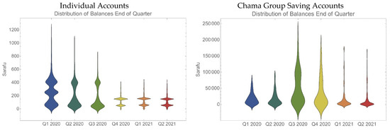 Violin Distribution Charts for End of Quarter Balances. Different colors represent different quarters from Q1 2020 to Q2 2021. Data from the xDai Blockchain. Units in Sarafu where approximately 100 Sarafu equals US$1.