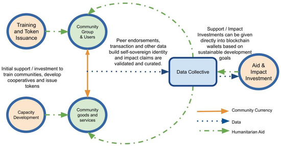 The blockchain allows for data collection that allows impact S hilling investment donors to give cash directly to recipients and social enterprises tied to sustainable development goals. Blue lines in Figure 6 show data shared by users. Community members can be endorsed on the basis of their data, or they can curate their own blockchain data profile to attract impact investors. CC transfers can also be distributed to users as aid or income on the basis of surveys and metrics e.g., on transaction data that proves residence in vulnerable household areas, helping to target future aid and cash transfer programs.20