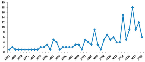 Figure 1 represents the time distribution of articles over the observed period, which covered years from 1955 to 2020. The observed period was divided by three depending on the volume and volatility of the number of publications. The first period covered the years from 1955 to 2001, during which 25.3% of analyzed publications were published 44 articles represent that. The average number of studies published annually is 1.83, while the maximum number of publications was published in 1992 and counted for 5. Further, the second period covered the 2002–2013 years, during which 32.2% of the total chosen articles were published, including 57 articles. On average, 4.67 documents were published per year, and the year of the highest number of publications is 2005, when nine studies were published. The third period covered the period from 2014 to 2020. In total, 74 articles were published during this phase, representing 42.5% of the total articles. On average, 10.57 articles were published per year, and the publication peak was reached in 2017 when 18 articles were published. Thus, it can be concluded that the number of publications is increasing rapidly during the third period (2014–2020). Although the first article was written in 1955, most studies were published after 2001 and peaked in 2017.