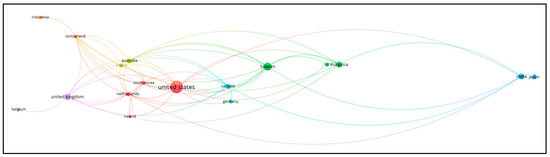 Figure 2 shows the countries represented by multiple clusters. The United States is a central cluster, around which most of the European and Canadian clusters are located. The Taiwan cluster represents the second-largest cluster, which relates to low-numbered small clusters of Asian-Pacific clusters. The figure also demonstrates Belgium, Indonesia, India, and Japan to be the countries with the least strength to the main contributing country, i.e., the United States (US). Indonesia is connected to Switzerland and from there, from afar, it is connected to the US; similarly with India and Japan, but a much greater distance is present. Belgium is connected to the United Kingdom, and the UK connects to the US at a similar distance to that of Switzerland and the US. Therefore, we could assume there is a weaker link between India and Japan to the US rather the Belgium and Indonesia to the US. On the other hand, the countries with a strongest links to the US, as observed from Figure 2, are the Netherlands, South Korea, Ireland, Canada, and Germany. The second largest contributing country is Taiwan as stated earlier, where the countries strongly linked to it are Malaysia, Canada, and Germany.