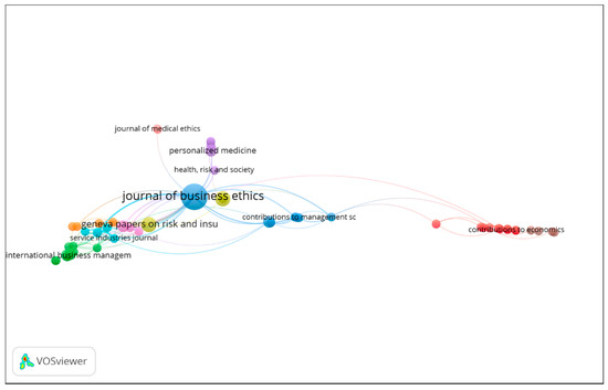 As Figure 3 illustrates, journals are divided into numerous clusters. These clusters are mainly connected with the central cluster of the Journal of Business Ethics. A group of small clusters in red and purple colors is poorly correlated with other journals.