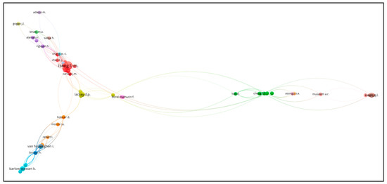 In total, 343 authors were covered by the literature review. Table 3 represents the authors with at least two publications in the dataset. Thus, the highest number of publications was provided by Tseng L.-M. (6 papers), and the remaining authors in the list were the authors of two research (see Table 3). In total, this group of authors represents 8.5% of all publications (from 402, as for many publications, more than one author was stated) and 9% of the citations (from 3315) (see Table 3). The visualization of cluster distribution of the authors by the number of publications is provided in Figure 4.