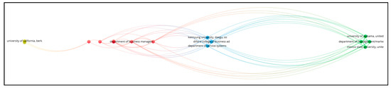 The visualization of interconnections between the organizations that funded the chosen studies is provided in Figure 5. As per the results of VOSviewer, the highest number of publications was funded by the following organizations: Department of Risk Management and Insurance, Feng Chia University, Taichung, Taiwan; School of Business, Monmouth College, West Long Branch, United States; Department of Training and Placement, Sastra University, Thanjavur, India; Department of Banking and Finance, Kainan University, Taiwan; Association of British Insurers, London, United Kingdom; and Business School of Beijing Technology and Business University, Beijing, China (see Figure 5).