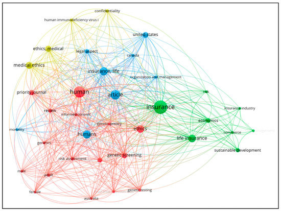 The first cluster is highlighted in red and includes 14 items. As supported by the VOSviewer output provided in Figure 7, these keywords received the most extensive attention from the researchers investigating green insurance practice. Cluster 1 includes the following keywords: insurance, life insurance, economics, risk, profitability, the insurance industry, commerce, Canada. Further, the second cluster is highlighted in green and includes 12 items. The most corresponding keywords in this cluster are human, humans, health insurance, genetic testing, adult, mortality, risk assessment, and life. The third cluster is highlighted in blue and includes 12 items. The words with the highest occurrence entail ethics, genetic screening, review, insurance selection bias, genetic diseases, and inborn. Finally, the fourth cluster is highlighted in yellow and includes 12 items. The critical keywords in this cluster are insurance life, article, the United States, medical ethics, ethics medical, confidentiality, human immunodeficiency virus. Four current streams of the research area were detected using the indicated clusters (see Table 7). Hence, considering keywords included in each cluster, the following current streams were displayed: insurance and economics, health and human, genetics, and ethics and insurance.
