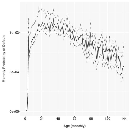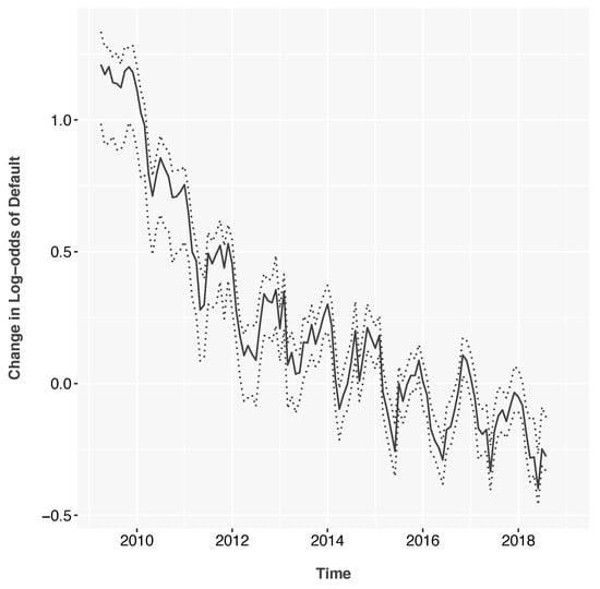The vintage function shows the risk of each monthly vintage relative to the average lifecycle and is therefore centered about 0. This shows a risk peak in 2007–2008, as was common in the industry. The portfolio also shows rising risk in the most recent years, again, as has been seen in other portfolios. Both peaks could be a combination of macroeconomic adverse selection (Breeden and Canals-Cerdá 2018) and increased risk appetite by the lender.