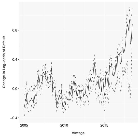 In the present context, these functions were estimated nonparametrically via Bayesian APC (Schmid and Held 2007). Nonparametric estimation is appealing for capturing details in the vintage and environmental functions. Because the lifecycle, credit risk, and environment functions are summed, only one overall intercept term may be estimated. By convention, the estimates are constrained so that the mean of the vintage function and mean of the environment function both equal 0. The relationship also requires that an assumption be made about how to remove the linear specification error. Consistent with earlier work (Breeden and Canals-Cerdá 2018), this is accomplished using an orthogonal projection onto the space of functions that are orthogonal to all linear functions. The coefficients obtained are then transformed back to the original specification.