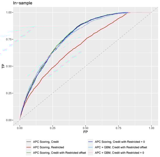 ROC curves for cumulative 36-month forecasts for the in-sample data set. FP is the false positive rate. TP is the true positive rate.
