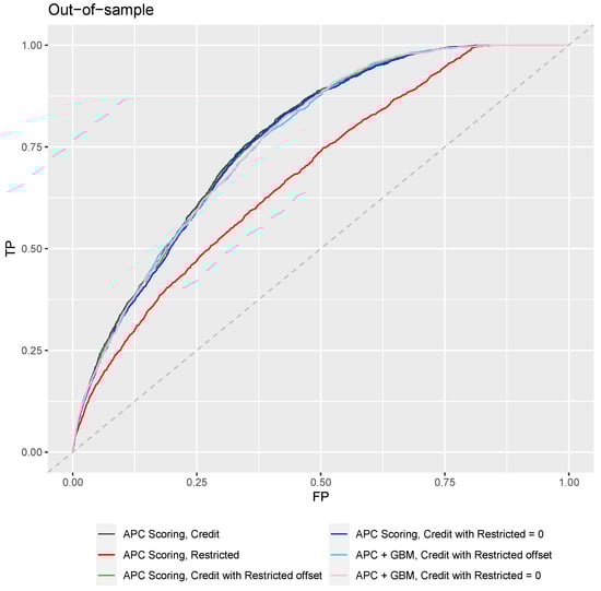 ROC curves for cumulative 36-month forecasts for the out-of-sample data set. FP is the false positive rate. TP is the true positive rate.