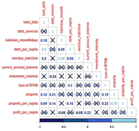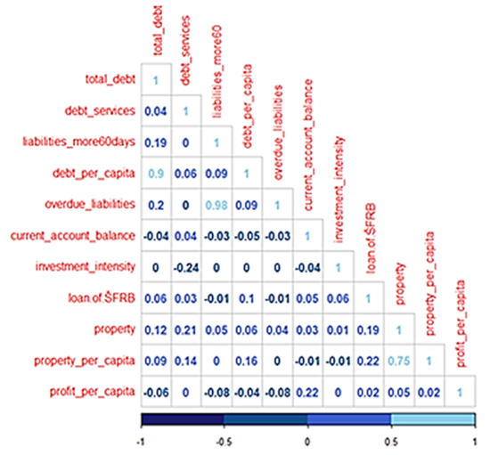 From the correlation analysis, it is obvious that the dependence between the total debt and debt services variables is almost 0, which indicates that there is no linear relationship between these variables. Conversely, a strong direct linear dependence between several variables was observed; e.g., overdue liabilities vs. liabilities due for more than 60 days (0.98) and total debt vs. debt per capita (0.9). This was mainly because these variables are based on a single source of data (financial documentation) and their calculation is similar. Most of the correlation coefficients oscillate around a value of 0, which indicates a nonlinear relationship (Equation (1)).