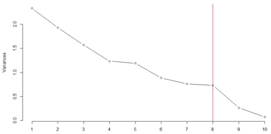 From the results shown in Table 2, the first component explains the least variability and the last component explains the most variability. At the same time, it can be seen that eight components are sufficient to explain 96.74% of the variation in the original file. It can be concluded that the rule stating that the number of main components must explain at least 70% of the total data dispersion has been followed. Figure 3 shows the explanation of the variability in the original file graphically using a screenplot. The screenplot explains the variance in the main components and shows a break in the graph.