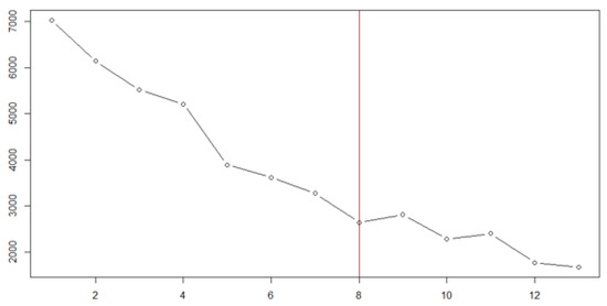 The process was continued by selecting the number of enterprise clusters. According to the heuristic approach, eight clusters were made using a screenplot. The number of clusters is illustrated by the x-axis, and the intra-cluster square is illustrated by the y-axis. The decision was made by minimizing the intra-cluster sum of the square. The number of enterprises in each cluster is shown in Table 3.