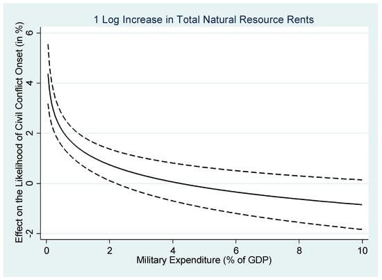 Table 5 reports results if we estimate the interaction model with military expenditures scaled by central government expenditures of country i in year t. The estimates in Table 5 show that in countries with a low share of military expenditures in central government expenditures, resource rents are positively associated with conflict risk. The higher the share of military expenditures in central government expenditures, the less likely it is that an increase in resource rents is associated with an outbreak of conflict. Take, for example, a country at the 25th percentile of the share of military expenditures in central government expenditures. At this relatively low share of military expenditures in central government expenditures, the estimates in Table 5 show that a 1 standard deviation increase in the GDP share of total natural resource rents is associated with an increase in the likelihood of civil conflict outbreak of over 2 percentage points (p-value 0.00). At the 90th percentile of the share of military expenditures in central government expenditures, the connection between resource rents and conflict is much weaker and not significantly different from zero. According to the estimates in Table 5, at the 90th percentile of the share of military expenditures in central government expenditures, a 1 standard deviation increase in the GDP share of total natural resource rents is associated with an increase in the likelihood of civil conflict outbreak of around 0.3 percentage points (p-value 0.33).