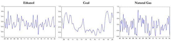 We also test the extent to which the dynamic correlation of commodity “i” co-moves with that of commodity “j.” A quick glance at Figure 1, Figure 2 and Figure 3 shows the apparent co-movements between some of these commodities. Table 5 presents the simple correlation between the DCC values. Some of the correlation values are negative and statistically significant. For example, we detect a negative correlation between the prices of ethanol and gold, gold and natural gas, natural gas and palladium, oil, and palladium. On the other hand, the majority of the other cases are associated with statistically significant positive correlations, particularly for precious metals. For example, the correlation between the DCC values of gold and silver is 0.73, and that between gold and platinum is 0.534. Overall, this picture reveals that the conditional slope among commodities is largely connected—a clear indication of their similar reaction to the current yield spread.