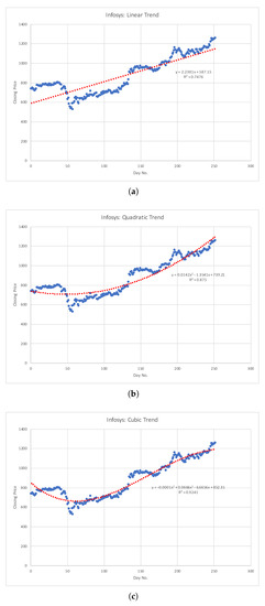 As an example, in Figure 1, we show the different trend lines fitted with the closing stock prices of Infosys (Software sector) for the period from 1 January 2020 to 31 December 2020.