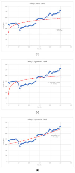 Trend lines for Infosys (Software Sector): January–December 2020. (a) Linear; (b) Quadratic; (c) Cubic; (d) Power; (e) Logarithmic; (f) Exponential.