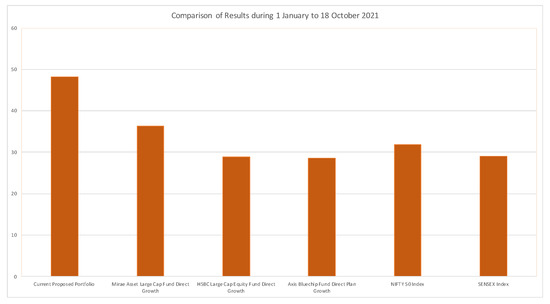 We further compared the performance of our portfolio with benchmark indices such as NIFTY 50 and SENSEX and observed that our portfolio gave better returns than those indices. In our previous work, which was for the period from 1 January 2021 to 21 May 2021, this portfolio gave an absolute return of 21.78%, whereas for the current period of 1 January 2021 to 18 October 2021, it has provided an absolute return of 48.18%. These data are tabulated in Table 8, and the graphical comparison is shown in Figure 2. It can also be observed that our portfolio beat the performance of several popular mutual funds in the current period as well.