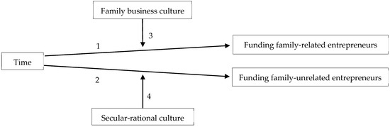 This brief theorizing contextualizes funding in time, specifically before and after the pandemic disruption, and contextualizes business angel funding in culture, specifically in family business culture, as this differs around the world, and in secular-rational culture, as also this varies around the world. The theorizing can be formalized as a conceptual scheme, Figure 1. Time affects people becoming business angels and funding family-related entrepreneurs; this effect is labeled 1 in the figure. Time also affects people’s funding of non-family entrepreneurs, labeled 2. Family business culture influences the impact of time on people’s funding of family-related entrepreneurs; this influence is labeled 3. Secular-rational culture influences the impact of time on people’s funding of non-family entrepreneurs; this influence is labeled 4.