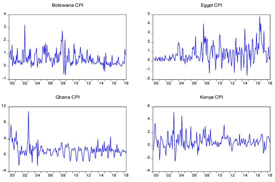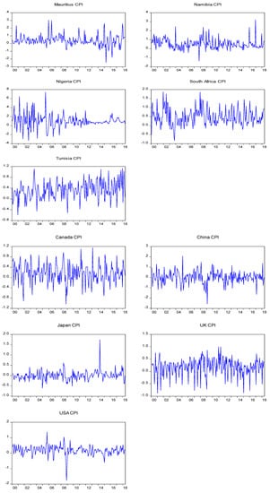 For the purposes of this study, monthly consumer price indexes (CPI) of nine selected African countries, South Africa, Egypt, Nigeria, Kenya, Tunisia, Ghana, Botswana, Mauritius, and Namibia; as well as from five developed economies, the USA, the UK, Japan, Canada and China, were obtained from DataStream for the period of January 2000 to June 2018, and considered for the construction of the inflation variable. The CPI was used to construct the inflation rate of these economies. We chose the nine African countries because they represent a group from all regions on the continent with active financial markets and institutions.