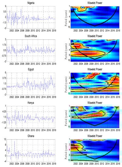 To commence analysis on the co-movement of inflation between African countries and their bilateral linkages with selected developed economies, we began by plotting the wavelet power spectrum of inflation rates in the countries under study, with results presented in Figure 2 and Figure 3.1 Figure 2 presents findings for the selected African countries, whereas Figure 3 shows a wavelet power spectrum of inflation rates2 for the developed economies.
