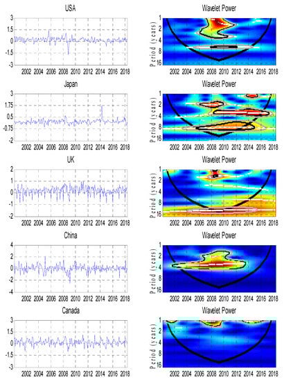 Wavelet power spectrum of inflation rates in selected five advanced countries.