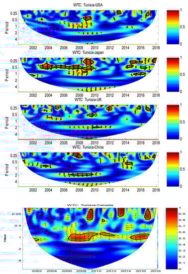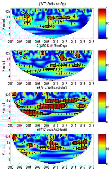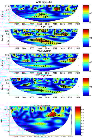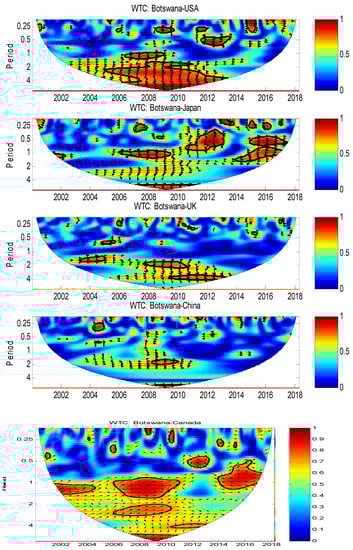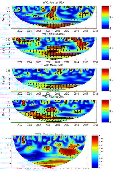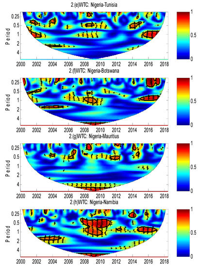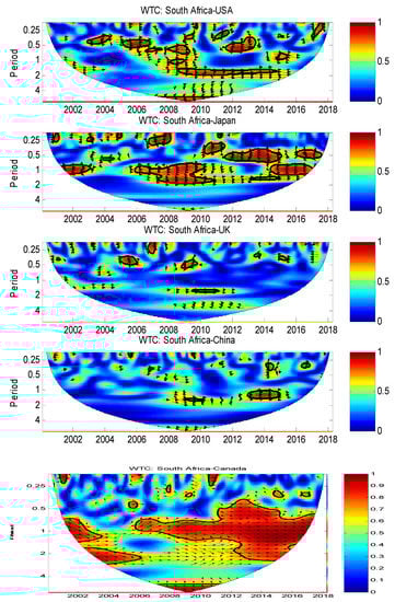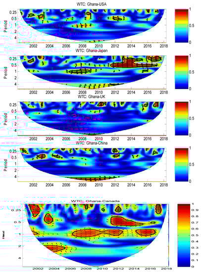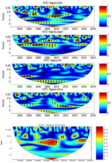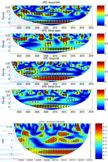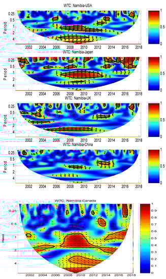 In the wavelet power spectrum of inflation presented in Figure 2 for the selected African countries, we find that Nigeria, Egypt, Kenya, Tunisia, Botswana, Mauritius, and Namibia have common features of higher time scales between 4–9 year time scales, with Ghana recording the highest time scales of 8–12 years. For the advanced economies, the wavelet power spectrum of inflation presented in Figure 3 reveals lower time scales between 2–4 years for the US, the UK, Japan, China, and Canada. However, it is noteworthy to surmise that because we take the absolute value of the imaginary part which fuels loss of information, the wavelet power spectrum is not a robust and sophisticated method to investigate inflation co-movement. Due to the limitation in the wavelet power spectrum (WPS, hereafter) tool, one is not certain that inflation will co-move or synchronize even if the two countries share a similar power region. To overcome the limitation of the wavelet power spectrum tool, we employed wavelet coherency using a Morlet wavelet to estimate local synchronization of inflation at different frequencies.