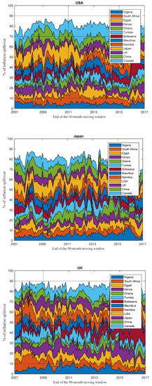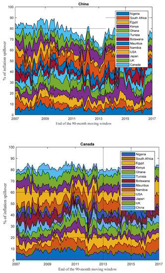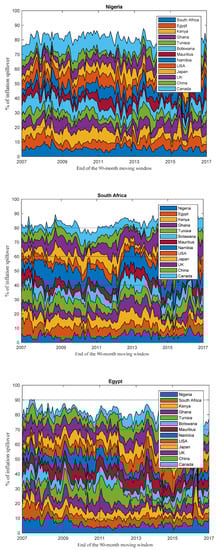 As anticipated, for the developed economies, we find that for US inflation, Canada explains almost 10–20% of total variation in US inflation. These findings are in consonance with the results reported by Tiwari et al. (2015), but differ from the findings of Yang et al. (2006), who found that US inflation has a relatively larger influence on the inflation of Canada and the United Kingdom. As mentioned earlier, the impact of Canada inflation on US inflation is a similar finding to those documented by Tiwari et al. (2015). These results suggest that the strong trade relation between the US and Canada could be the driving force behind the strong inflation co-movement between these two countries. For the US, we see from the diagram that Nigeria and South Africa account for about 5–10% of variation in US inflation. For Canada, China, Japan, and the UK, we see that Nigeria, South Africa, and Egypt, on average, explain almost 5–20% of inflation variation in those countries. This could be because the majority of these countries trade with Africa for its natural resources, such as gold, oil, etc., thereby explaining the variation in inflation between these countries.