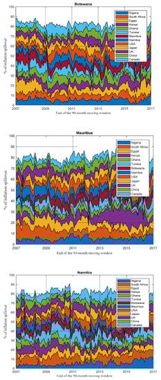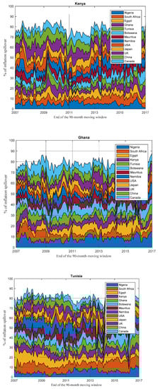 As we argued that inflation co-movement could be fueled by inflation spillover between countries in the sub-region, and, as a result, any two countries will exhibit inflation synchronization when inflation is high, we compare our earlier results obtained from the CWT synchronization measure of inflation co-movement with the Diebold and Yilmaz (2012) spillover index to measure inflation spillover between the selected nine African and five advanced economies. We thus compute a time-varying spillover index using a 90-month moving window. The results are presented in Figure 6, depicting the cumulative percentage of inflation spillover received by each of the 14 countries from the countries in our sample.
