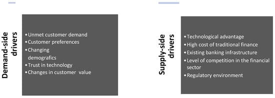 To answer the first research question, the desk research method was used. An in-depth analysis of the existing research results has allowed to split external factors which explain why FinTechs and BigTechs have grown more in some countries or regions, into supply-side and demand-side drivers. The most important of these drivers are shown in Figure 1.