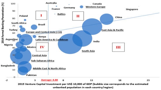 While the research cited so far has identified factors that affect the current position of technology companies by International Finance Corporation (a member of the World Bank Group) shows how selected factors can influence the potential market position of banks and technology companies and thus their forms of interactions. They found that the key challenges that have affected the digital transformation of financial services across countries and regions are: low level/penetration of formal financial services, low income and financial literacy levels, underdeveloped technology and venture capital ecosystems and weak infrastructure. As proxies for these four challenges they assumed formal banking penetration (representing the first two challenges, and displayed along the y-axis) and venture capital (VC) investment relative to GDP (representing the last two challenges, and displayed along the x-axis). The bubble sizes correspond to the estimated number of unbanked in each country. In the study the World Bank classification of countries by regions was applied. Taking the average venture capital penetration and the least-squares trend line for the interaction of the two variables as dividing lines, they get the four quadrants shown in Figure 2. The values for the US (quadrant II) are outside the shown scale, i.e., 50 for x-axis and 94% for y-axis.