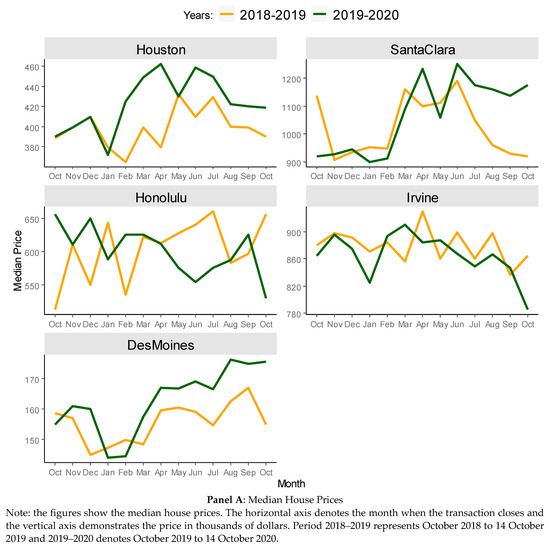 We then discuss the house prices and transaction volumes shown in Panels A and B in Figure 1. In Panel A, the horizontal axis represents the month in which the transaction closes and the vertical axis denotes the average median house prices in thousands of dollars. For the labels, 2018–2019 represents the time from October 2018 to October 2019 and 2019–2020 provides the time from October 2019 to Mid-October 2020. From the figure, we could observe that the median house price in Houston dropped in May 2020. However, afterwards, the price stays higher than that of the previous year. For Honolulu, regarding the decline in house prices, it is more profound that the decreasing rate from the previous year is higher, and the duration of the decrease is also longer compared to other areas. Irvine also experienced a decrease in house prices relative to the previous year. For Des Moines and Santa Clara, the house prices generally increase from the previous year, especially for Des Moines, which did not even experience any decreases after the COVID outbreak. This might be because that, for Des Moines and Santa Clara, the houses sold after COVID-19 are larger than those from before. While for Honolulu and Irvine, there maybe have been more transactions for smaller houses compared to before COVID-19.