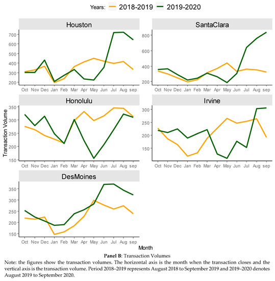 We next turn to the transaction volumes shown in Panel B of Figure 1. The changes in transaction volumes are quite similar for Houston, Honolulu, Irvine and Santa Clara. Specifically, the volume dropped after the outbreak in April and May and then increased to levels surpassing or equal to those of the previous year. It appears that the housing markets are making up for the lost transactions in April and May. For Santa Clara, the increase in transaction volumes is larger than the decrease before, suggesting that the lower interest rates might encourage more transactions. For Des Moines, the transaction volumes did not decrease but the increasing rate seemed to be disrupted in May. This is possibly due to the fact that real estate is categorized as an essential service in Iowa.