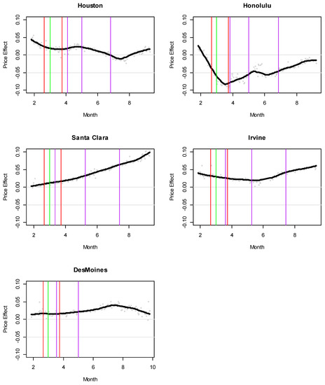 Using the revised difference-in-differences method with non-parametric smoothing, described above, we present the COVID-19 effect on house prices for Houston, Santa Clara, Honolulu, Irvine, and Des Moines, shown in Figure 2. The horizontal axis represents February to mid-September of 2020. The transaction time from the original data dates from March to Mid-October of 2020, which specifies when the transaction closes. However, since the transaction normally takes about 30 to 45 days, we subtract 37.5 days from the original time to better represent the market conditions for when the offer is signed. To compare how the changes of house prices relate to the stay home orders, we include the start of the stay home order, the first reopening of the economy and the reverse of the reopening as three vertical lines colored purple for each of the five areas. The vertical axis shows the price impact, and an effect of 0.05 indicates that the outbreak leads to a house price increase of 5% relative to before the outbreak. The averages of the point estimates in Figure 2 are provided in Table 3.