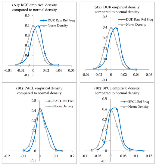 In Figure 1, Panels A–C plot the distributions of realized returns over the data period for the stocks. For purpose of comparison, the normal density is also plotted as if the data was drawn from a normal distribution having same mean and variance. The graphs demonstrate negative skewness and positive excess kurtosis (fat tails) for all stocks.