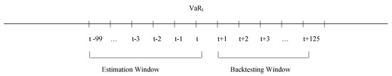 Estimation and backtesting windows. This figure shows the estimation and the backtesting windows. VaR on day t is estimated using the past 100 days of data for Model 1 (using historical simulation), Model 2 (assuming normality of raw returns), and Model 3 (after transforming raw data). Then the exceptions test is carried out for a window of 125 days following the VaR estimate at date t. Both windows are rolled forward by one day and the procedure repeated for both models until the sample period is exhausted. This leads to testing of exceedances of VaR limits over 47,000 data points.