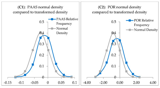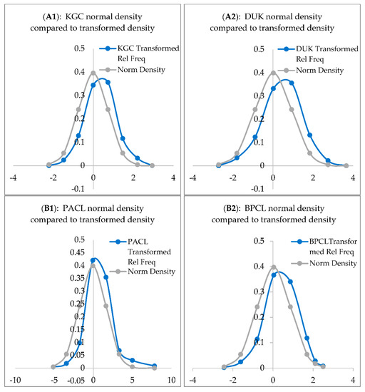 We plot the transformed data densities for KGC and DUK in panel A, for PACL and BPCL in panel B, and for PASS and POR in panel C of Figure 3, respectively. For comparison purposes, we superimpose normal densities on plots of the stocks. The graphs show interesting patterns when compared to the corresponding raw data plots of Figure 1. We notice that the mode for the transformed data has decreased for the all the stocks studied. The reduction is less noticeable in the case of PACL. The effect of the transforms is to redistribute probability mass from the center towards the left tail of the raw distribution. Simultaneously, mass in the tails is also reduced and redistributed over the rest of the return values.