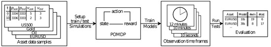 To evaluate the observation time effects, we train Q-Learning agents for each combination of observation duration and asset. Then, we run 25 tests on the test data set to level out inconsistency. Based on this, we have systematically adjusted the observation length to warring degrees in order to use different lengths of observation time frames. Each one of 25 testing cycles starts with a certain amount of equity. We then perform 100 test trades per cycle, in each of which the agent makes a decision on their given information and waits for the market environment to yield a profit or loss. At the end of each cycle, we check whether the total equity has increased or decreased. If an agent closes a test run with a positive increase in equity, we count it as a win. As an indicator for the performance of an agent, we simply count the number of tests with financial wins or losses. We did not consider the total amount of equity won or lost, but just counted the signs of profit. This allows us to compare a wide spread of possible observation time-scales, as the total success does not rely on concrete prices and leverages. One example for this can be seen in Figure 2, where the total margin did rise a substantial amount, but fell down to being just a small amount above the starting point, and this was still counted as a win for the agent, especially considering possible applications for a high-frequency trading setting, in which even smaller periods of time can decide whether it was a win or a loss. A flowchart showing the evaluation setup can be found in Figure 3.