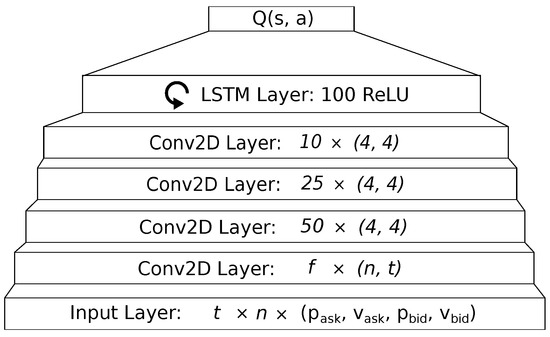 The neural network architecture used in our evaluation. For a number of observed assets n over a time span t, the input layer consists of (t × n × 4) input neurons. For the following convolutional layer, we choose the number of filters f, such that the resulting activation shape fits into the later convolutional layers. After the convolutional part, we employ a LSTM layer, consisting of 100 recurrent neurons with rectified linear activation.