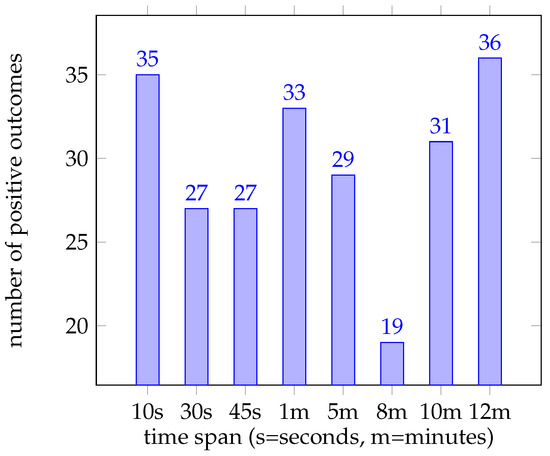 The number of positive outcomes over all tests with a certain observation period. As shown in the chart, one can find the highest distribution of wins at the 12 min mark, closely followed by 10 s, while by far, the lowest distribution is found at the 8 min point.