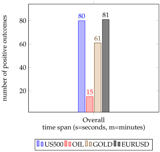 The total number of positive outcomes per asset, added across all time spans. We find a hardship in trading on the OIL market, but a successful application in the EURUSD and US500 foreign exchange.
