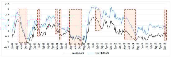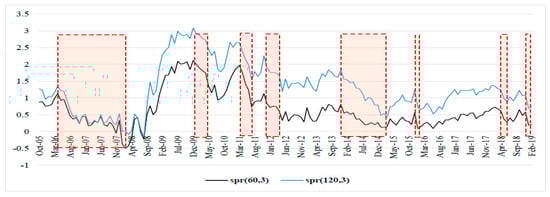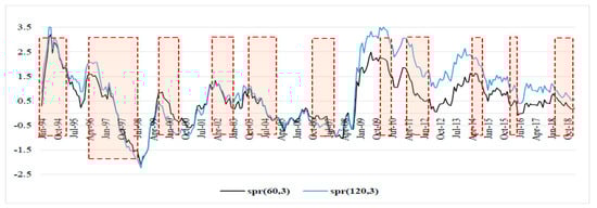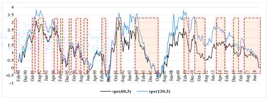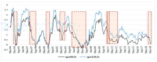 For Italy (Table A1, Table A2 and Table A3), we note that the term spread has a negative association with the economic activity in all k-month horizons. This implies that a positive value of the spread ( s p r i t ( 60 , 3 ) ) predicts a slowdown of the economic activity for Italy. The negative association is plausible when the increase in the long-term bond rate is only marginally higher than the short-term rates, and when there is a subsequent investors’ preference to hold long-term bonds instead of short-term bonds. This can be the case especially if the investors or market participants have a pessimistic outlook of the economy (FocusEconomics 2019).