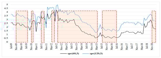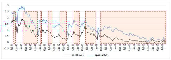 A common observation between all the countries, except for Italy because of missing data from earlier than 2009, is that they were affected by the 2007–2008 global financial crisis (GFC). The term spread started to decline at least 12 months before the onset of the GFC, and this is consistent for all countries (Figure 1, Figure 2, Figure 3, Figure 5, Figure 6 and Figure 7). Moreover, the term spread for the UK and the US started to decline from as early as 2004, thus signaling economic slowdown in the two economies much earlier than the other countries in the G7, and the effect of this later culminated into the GFC of 2007–2008.