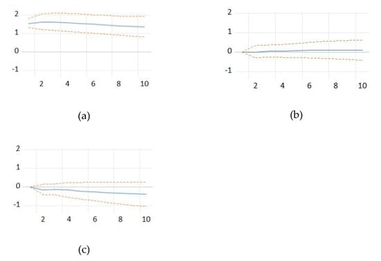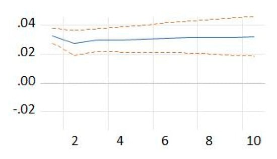 Equation (16) is the error correction equation and it signifies the long-run relationship among the variables. is the lagged value of the residuals obtained from the cointegrated regression of the dependent variable of the regressors. It contains long-run information derived from the long-run cointegrating relationship. In the analyzed dataset, the labor productivity shows a negative (−) association with GDP per capita, number of dead enterprises and number of persons employed in newborn enterprises. A positive (+) association appears with number of active enterprises, number of newborn enterprises, number of persons employed in active enterprises and number of persons employed in dead enterprises. As the variables are in logarithms, the coefficients can be interpreted as long-run elasticities. The result of Equation (16) as shown above is found to be questionable in terms of the labor productivity that has a negative sign with the GDP per capita relationship. This result is not in line with economic theory, suggesting the need to consider other variables in addition to modeling.