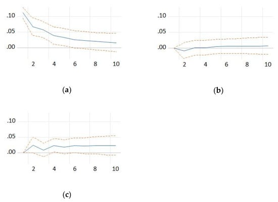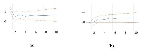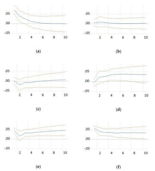 When the analyzed variables are cointegrated, a VEC model can be constructed. Since the variables are not stationary (I (1)) and are not cointegrated, we first differentiated the variables, and we estimated the variables in the first differences of the variables. Constraints are introduced in the VEC model to allow long-term and short-term dynamic examination of the cointegrated series. In the case of studying economic relationships that are correlated and show long-term and short-term relationships, VEC models enable the separation of long-term and short-term components (Wooldridge 2008) (Asteriou and Hall 2016) (Hill et al. 2018).