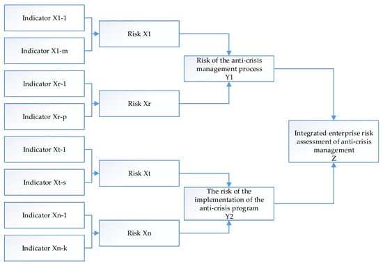 A generalized model of integral risk evaluation of the enterprise anti-crisis management (the authors’ development). Note: ()—process’ risk indicators of the anti-crisis managerial activity; ()—risk indicators of the process on anti-crisis program implementation; ()—the risks of a process of anti-crisis managerial activity; ()—the risks of a process of implementation of the program.