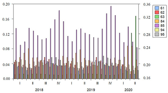 In many cases, the share of the given product of total exports was less than 1%. Therefore, we have omitted some products for greater clarity. We have selected the products which had a greater share than 5% of total trade in any month except apparel knitted products. The highest value of apparel knitted is 4.9%, but we have included this article because it is very close to 5%. Seven products fulfilled this criterion. From 99 products, we have chosen the products with H.S. codes 61, 62, 63, 84, 85, 94, and 95. Hereafter, we will use short names for the products. These are apparel knitted for 61, apparel not knitted for 62, other made-up textiles for 63, machinery for 84, electrical machinery for 85, furniture for 94, and toys for 95. Figure 2 shows that machinery and electrical machinery were the main imported products of the EU-15 countries from China. Two of them always had a higher proportion than 20% of total trade and, furthermore, electrical machinery reached, and exceeded, 30% of the total trade.